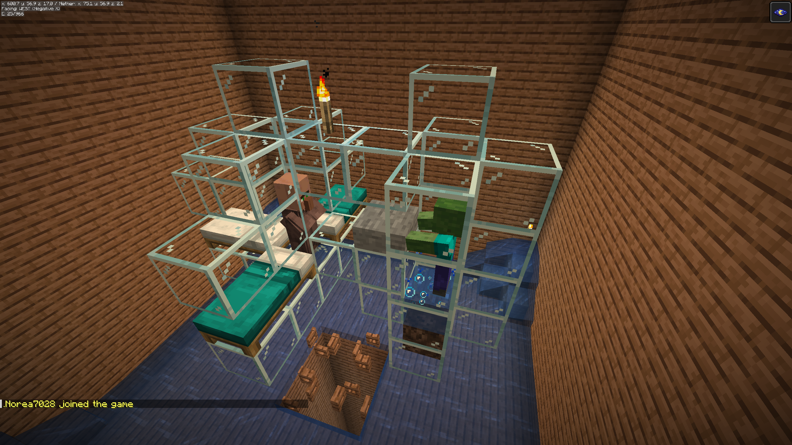 Da die Dorfbewohner nur selten in den 'Gossip' Zustand gehen, sind panikbasierte Farmen deutlich schneller. Die Farm auf dem Server ist ebenfalls panikbasiert. Das Bild zeigt, wie die Farm von innen aussieht (und wie Norea meinem Screenshot aufgelauert hat). Der Zombie ist auf einer Wassersäule, welche durch den Seelensand erzeugt wird. Dadurch bewegt er sich hoch und runter und die Dorfbewohner sehen ihn nicht permanent. Dies erlaubt es den Dorfbewohnern schlafen zu gehen, aber sorgt gleichzeitig dafür, dass Sie sich permanent im 'Panik' Zustand befinden. Die Eisengolems können nicht auf dem Glas spawnen, landen also immer im Wasser und werden in das Loch in der Mitte geschwemmt. Dies sorgt dafür, dass die Golems möglichst schnell wieder aus der Reichweite der Villager raus sind.