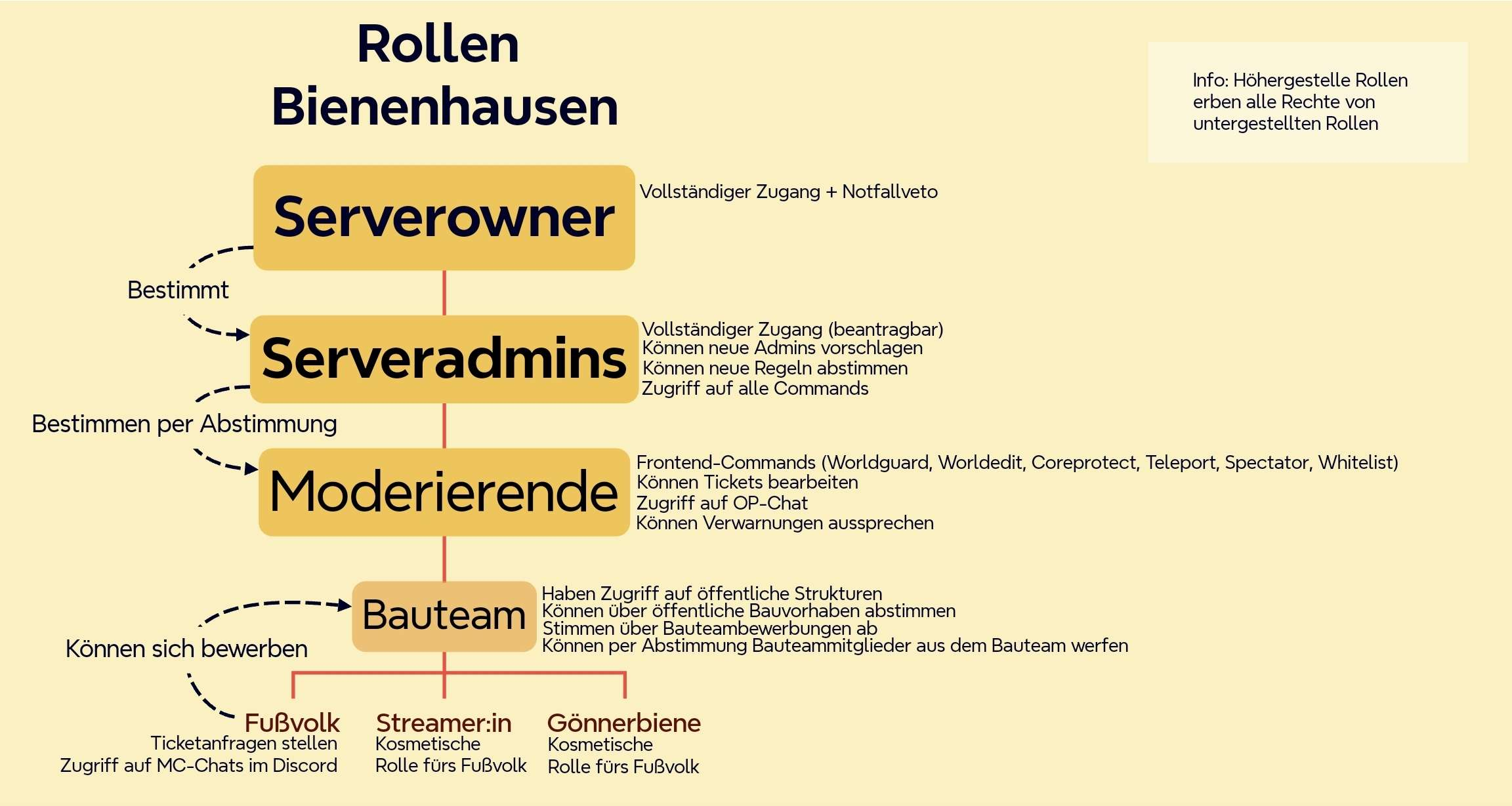 Die Schnellübersicht zeigt, welche Rollen auf dem Server existieren und in welchen Abhängigkeiten diese zueinander stehen. Genauere Informationen zu Bauteambewerbungsprozess findet ihr hier.